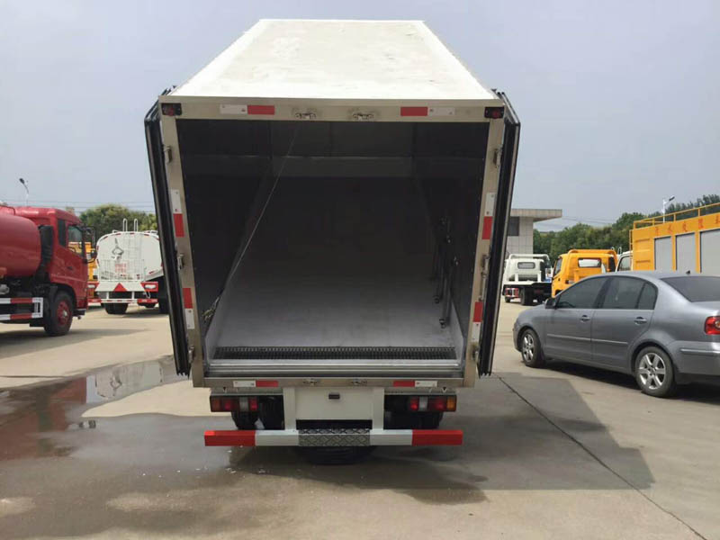 七 廂體配置:我公司面包式冷藏車工藝采用專用模具壓制成型,保溫性能達到國家A級標準,保溫材料為無縫隙填充聚氨酯發泡,廂體內外采用高強度玻璃鋼板材質,樹脂膠無縫連接,后配全密封雙開門,不銹鋼門框包邊,不銹鋼合頁和鎖件,廂體內部加裝LED夜間照明燈。