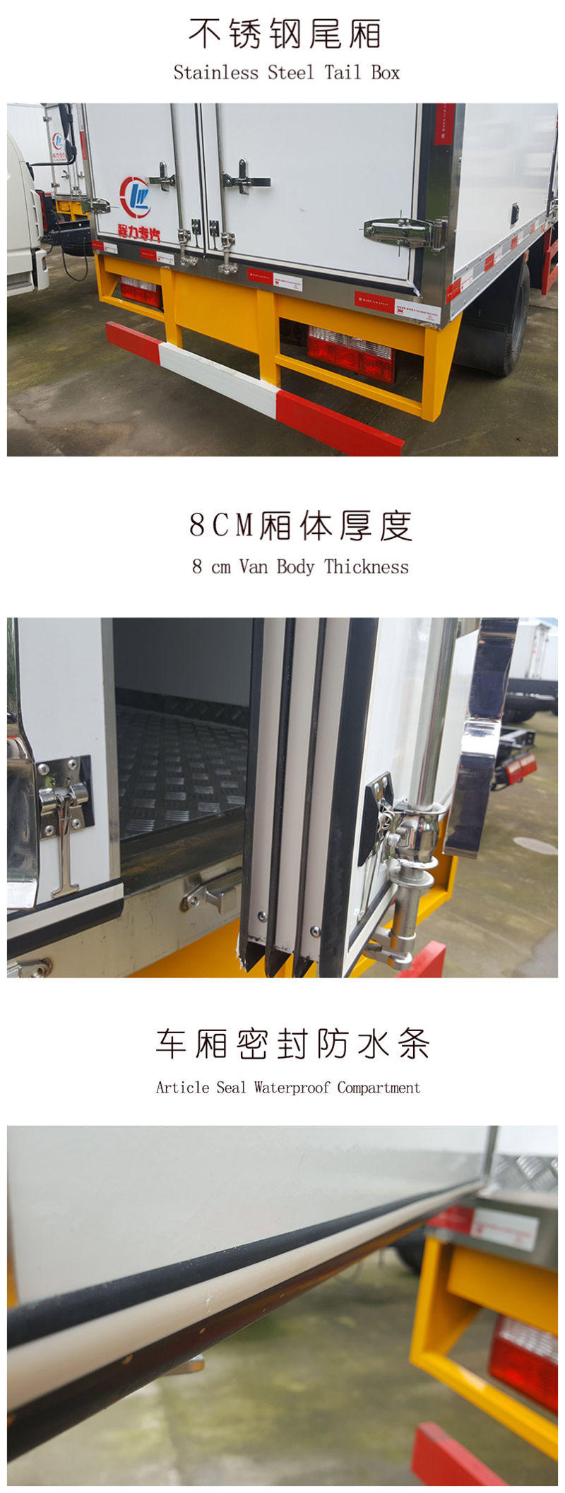 七 廂體配置:我公司面包式冷藏車工藝采用專用模具壓制成型,保溫性能達(dá)到國家A級標(biāo)準(zhǔn),保溫材料為無縫隙填充聚氨酯發(fā)泡,廂體內(nèi)外采用高強度玻璃鋼板材質(zhì),樹脂膠無縫連接,后配全密封雙開門,不銹鋼門框包邊,不銹鋼合頁和鎖件,廂體內(nèi)部加裝LED夜間照明燈。
