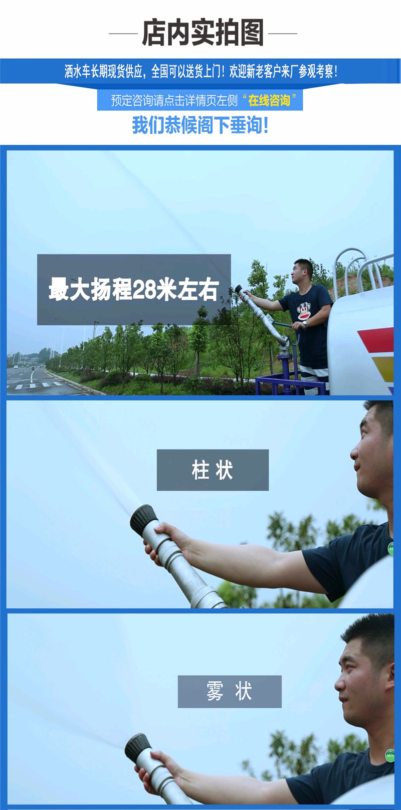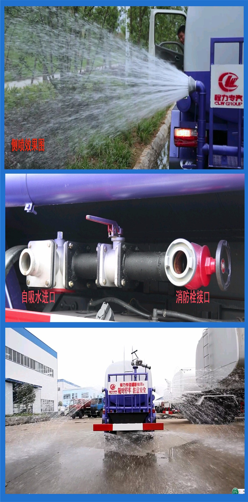 東風小多利卡5噸灑水車,采用東風原廠底盤,朝柴102馬力發動機或玉柴115馬力發動機,萬里揚5檔變速箱,7.00R16鋼絲胎;帶前沖、后灑、左右側噴水,帶后工作平臺、平臺上安裝綠化灑水高炮(炮噴射形狀可連續調節:直沖、大雨、中雨、毛毛雨,可360°旋轉),配消防接口,自流閥,濾網,帶專用灑水泵具有自吸自排功能;灑水寬度≧14-16米,射程≧28米,罐體采用優質碳鋼制作。帶2根吸水管,音樂喇叭,視水管;隨車文件:整車合格證、底盤合格證、上戶發票、保修手冊、免征圖冊和整車說明書; |
