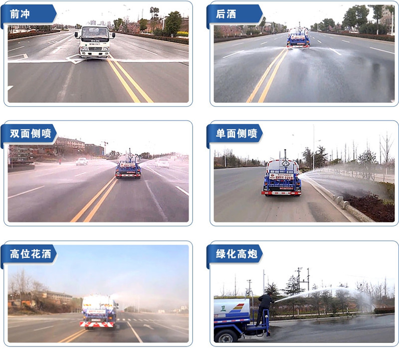 底盤配置:國五排放標準,萬里揚5檔變速箱,192大梁,前橋2噸,后橋4噸,700R16原廠胎,單排可翻轉(zhuǎn)新款駕駛室,方向助力,離合助力。 上裝配置:罐體采用4毫米厚武鋼板,焊接而成,內(nèi)設(shè)防浪板,程力大功率灑水泵,可自吸水,加壓排水,前沖15米寬,后灑壓塵,側(cè)噴花灑噴頭,尾高綠化高位水炮,射程28米,可調(diào)節(jié)水柱、大中雨、毛毛雨等 ,可做臨時消防滅火用。