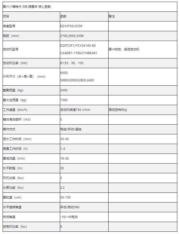 國六小福瑞卡 5噸 噴霧車規格型號/配置/參數